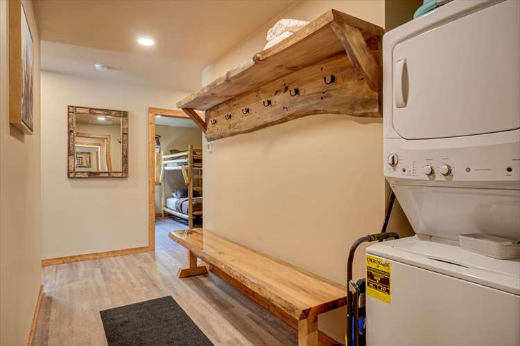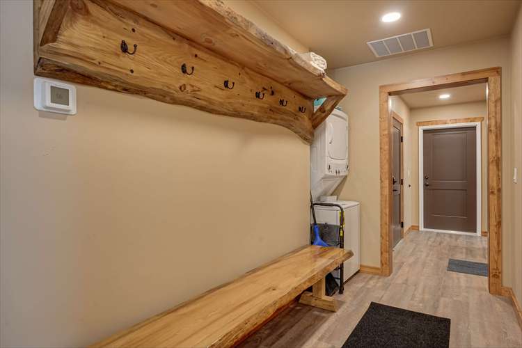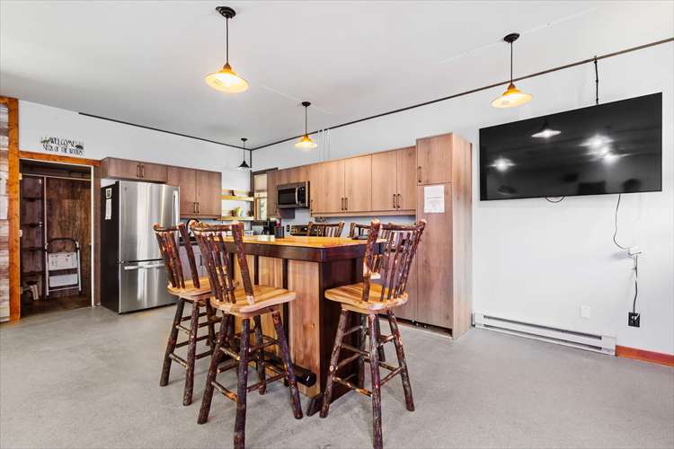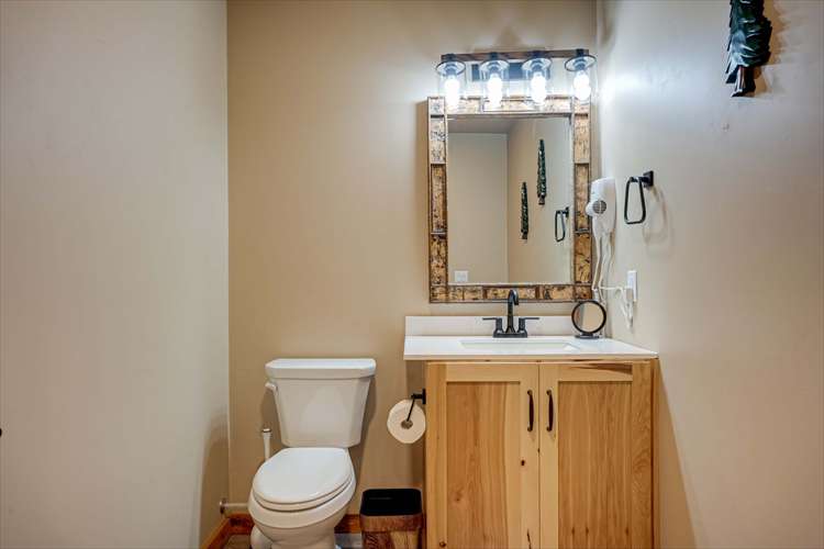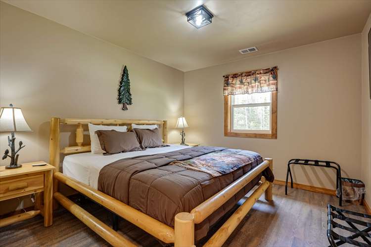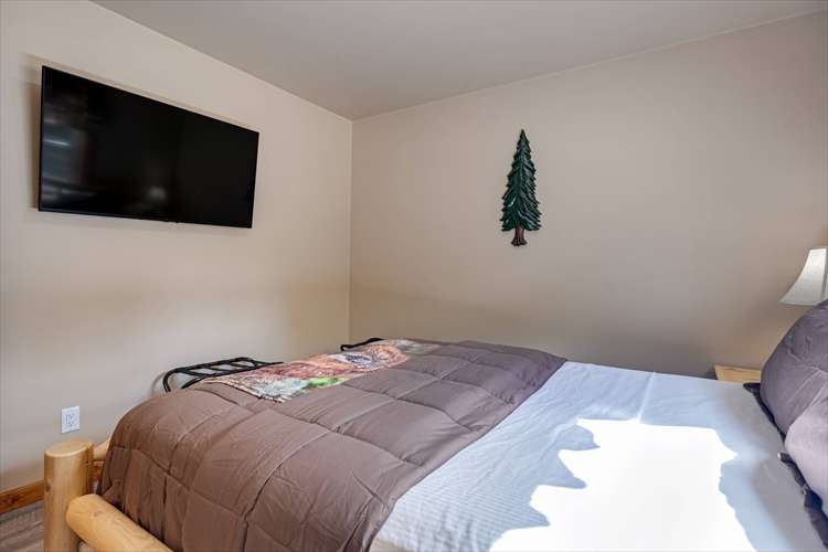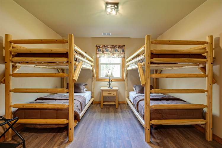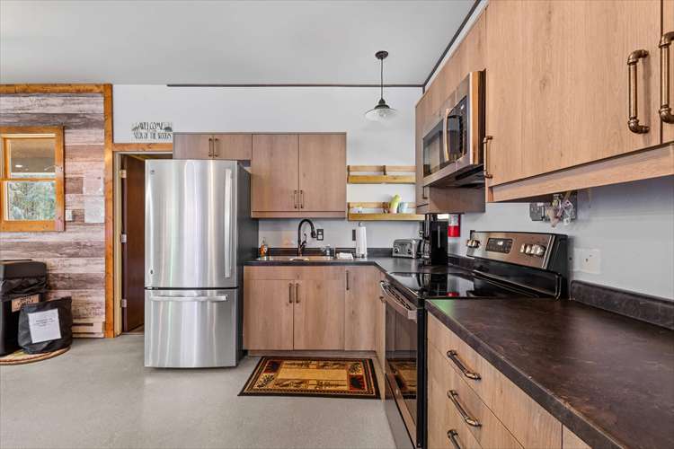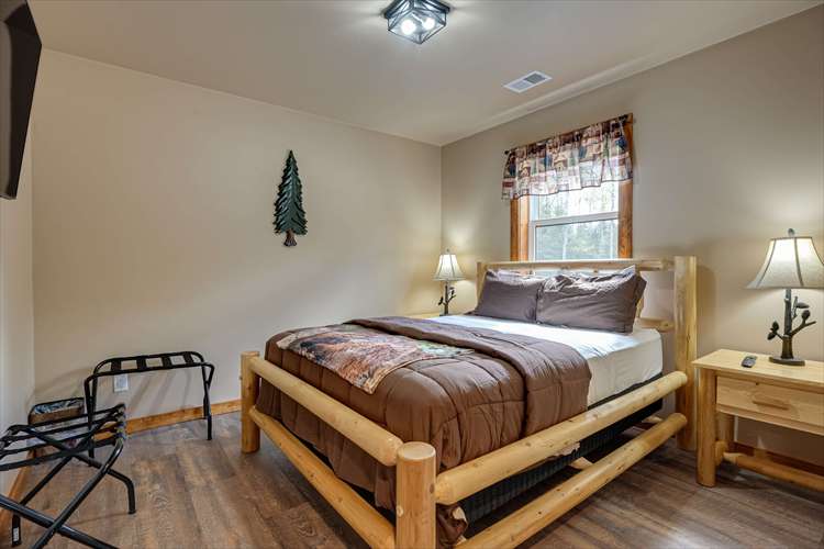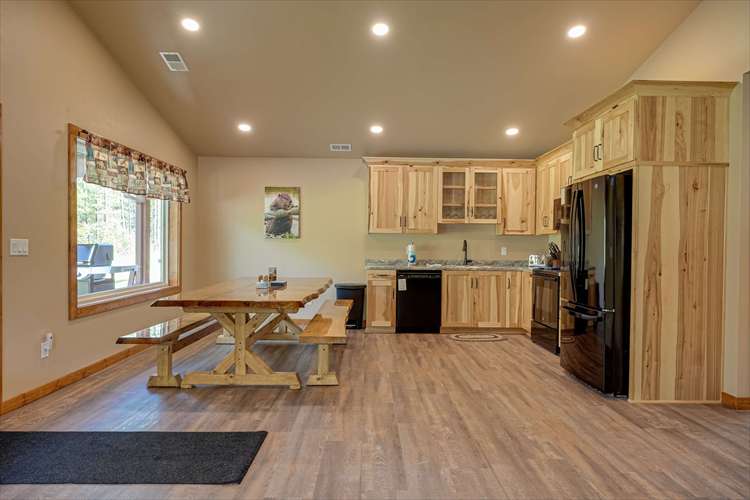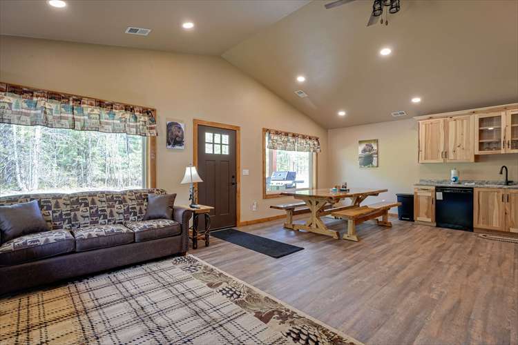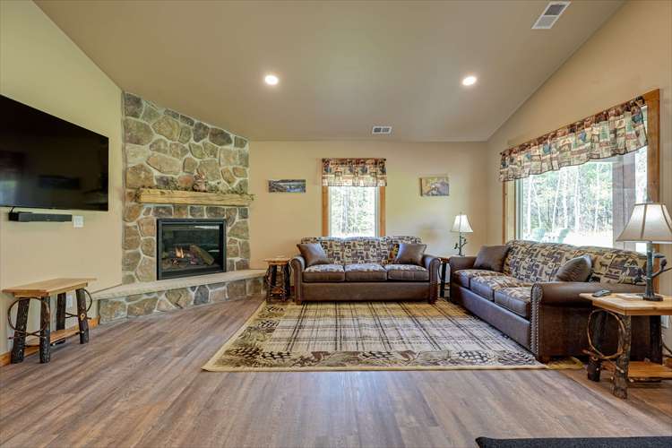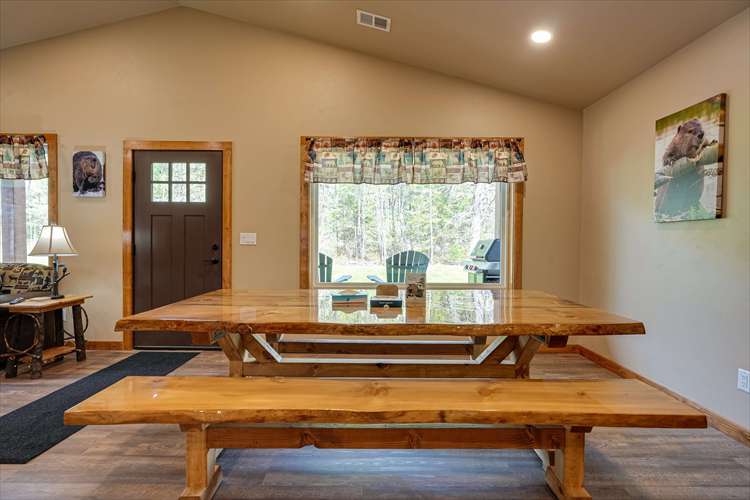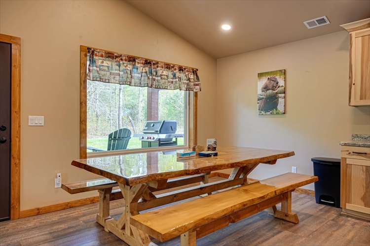 Upon entering the cabin, a bright interior and a cozy atmosphere greet you throughout the well-appointed living area. Enjoy the whimsical, natural theming throughout the space - from the decor to the rustic and modern furnishings. Relax and make yourself at home by resting on the plush furniture, streaming a movie marathon on the large TV, or curling up with a good book before a glowing fire in the grand stone fireplace. The open-concept floor plan was designed with togetherness in mind so that no conversation would be lost. Prepare grand meals or quick snacks for your outdoor adventures in the sophisticated eat-in kitchen, boasting brand-new appliances, ample cupboard room, and a formal dining table. Host barbecues or sip your morning coffee on the patio while listening to the tranquil sounds of nature.