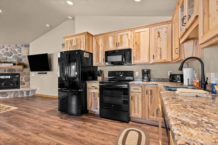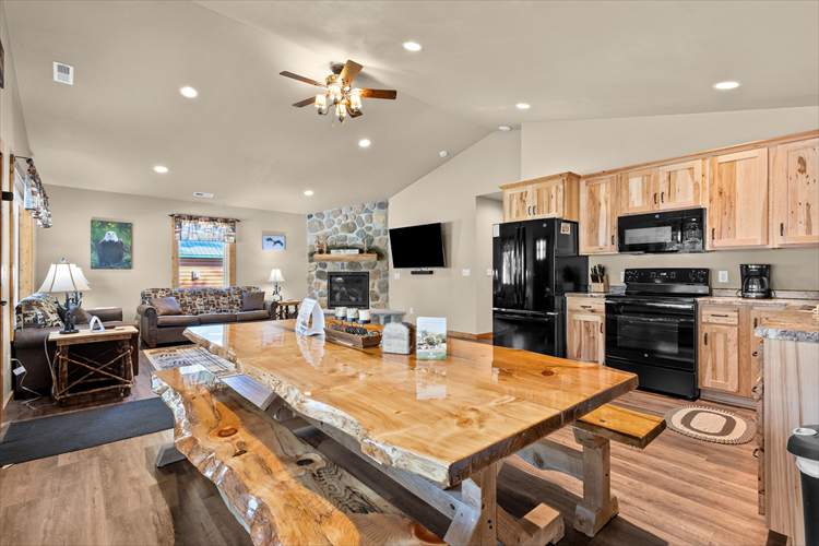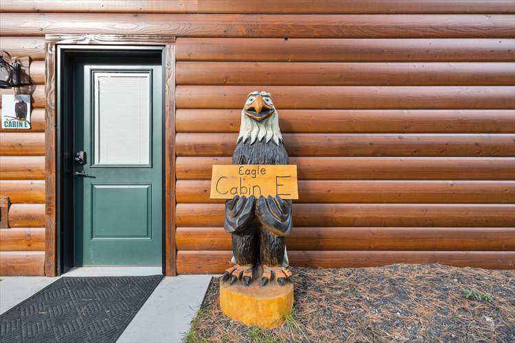 Inside the cabin, you'll be greeted with a bright interior and a cozy atmosphere throughout the well-appointed living area. Enjoy the whimsical theme of Eagles throughout the cabin, from the decor to the rustic furnishings. Relax and make yourself at home by resting on the plush furniture, streaming a movie marathon on the large TV, or curling up with a good book by the crackling fire in the grand stone fireplace. The open-concept floor plan was designed with togetherness in mind so that no conversation would be lost here. Prepare grand meals and hiking snacks in the sophisticated eat-in kitchen, equipped with brand-new appliances, ample cupboard room, and a formal dining table. Host barbecues or sip your morning coffee on the patio while listening to the tranquil sounds of nature.