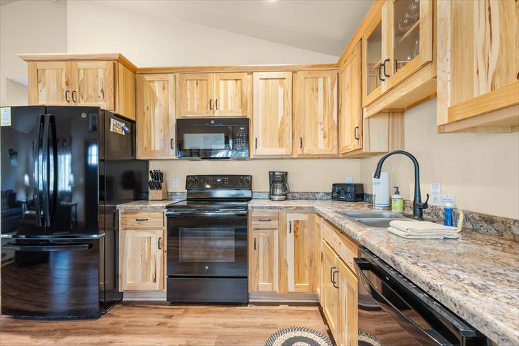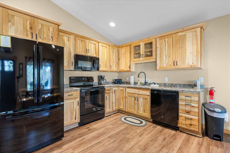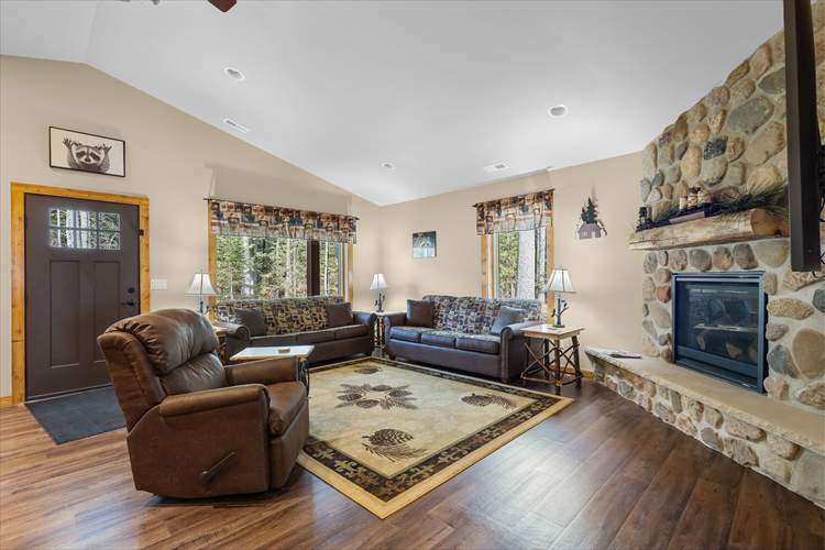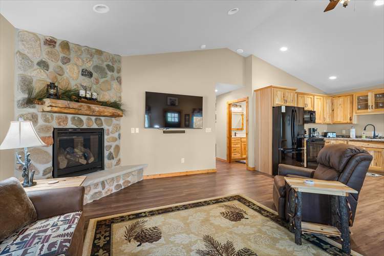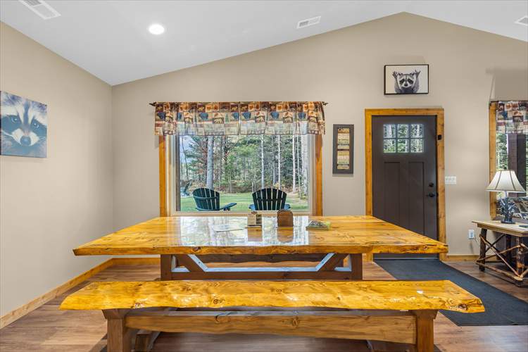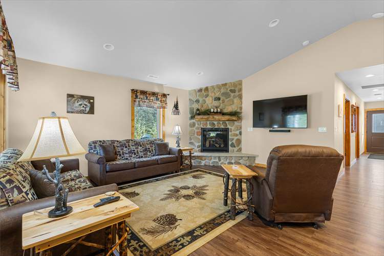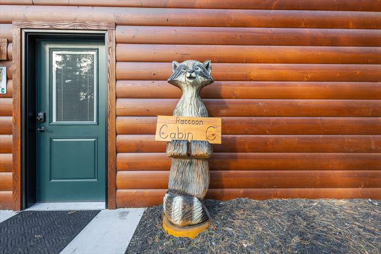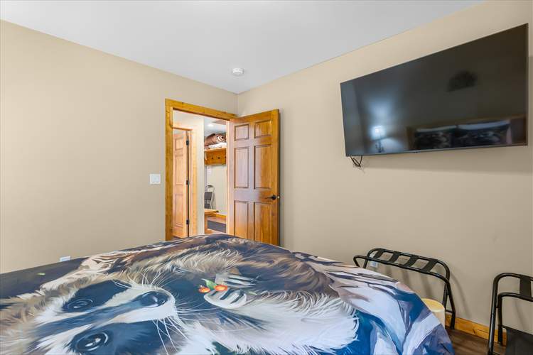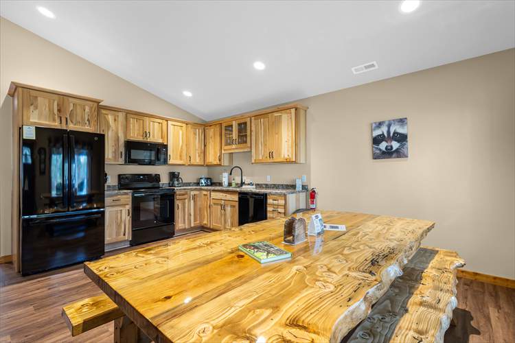 Upon entry into the cabin, you'll be met with a bright interior and a cozy atmosphere throughout the well-appointed living area. Enjoy the whimsical theme of Raccoons, with the decor and furnishings creating a modern yet rustic surrounding. Relax and make yourself at home by resting on the plush furniture, streaming a movie marathon on the large TV, or curling up with a good book by the crackling fire in the grand stone fireplace. The open-concept floor plan was designed with togetherness in mind so that no conversation would be lost here. Prepare delectable delights and outdoor adventure snacks in the sophisticated eat-in kitchen, with brand-new appliances, ample cupboard room, and a formal dining table. Host barbecues, serve cocktails, or sip your morning coffee on the patio while listening to the tranquil sounds of nature.