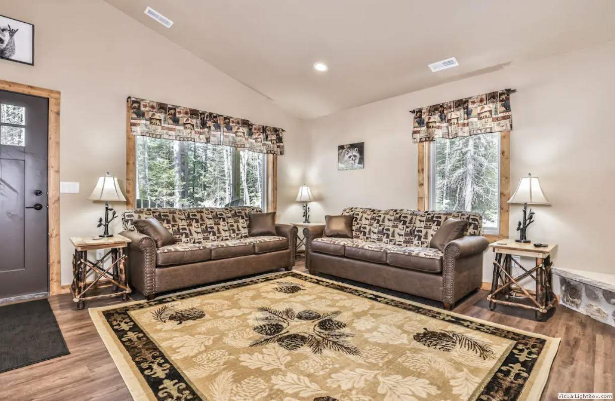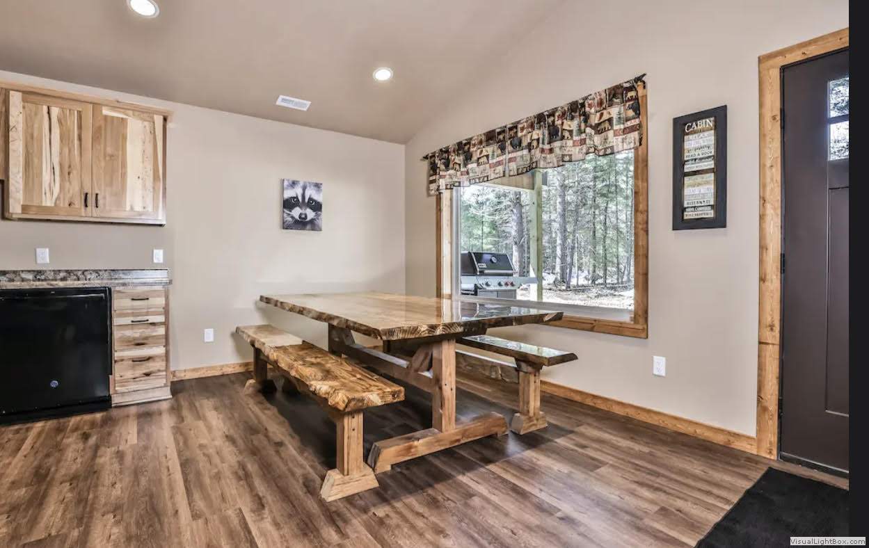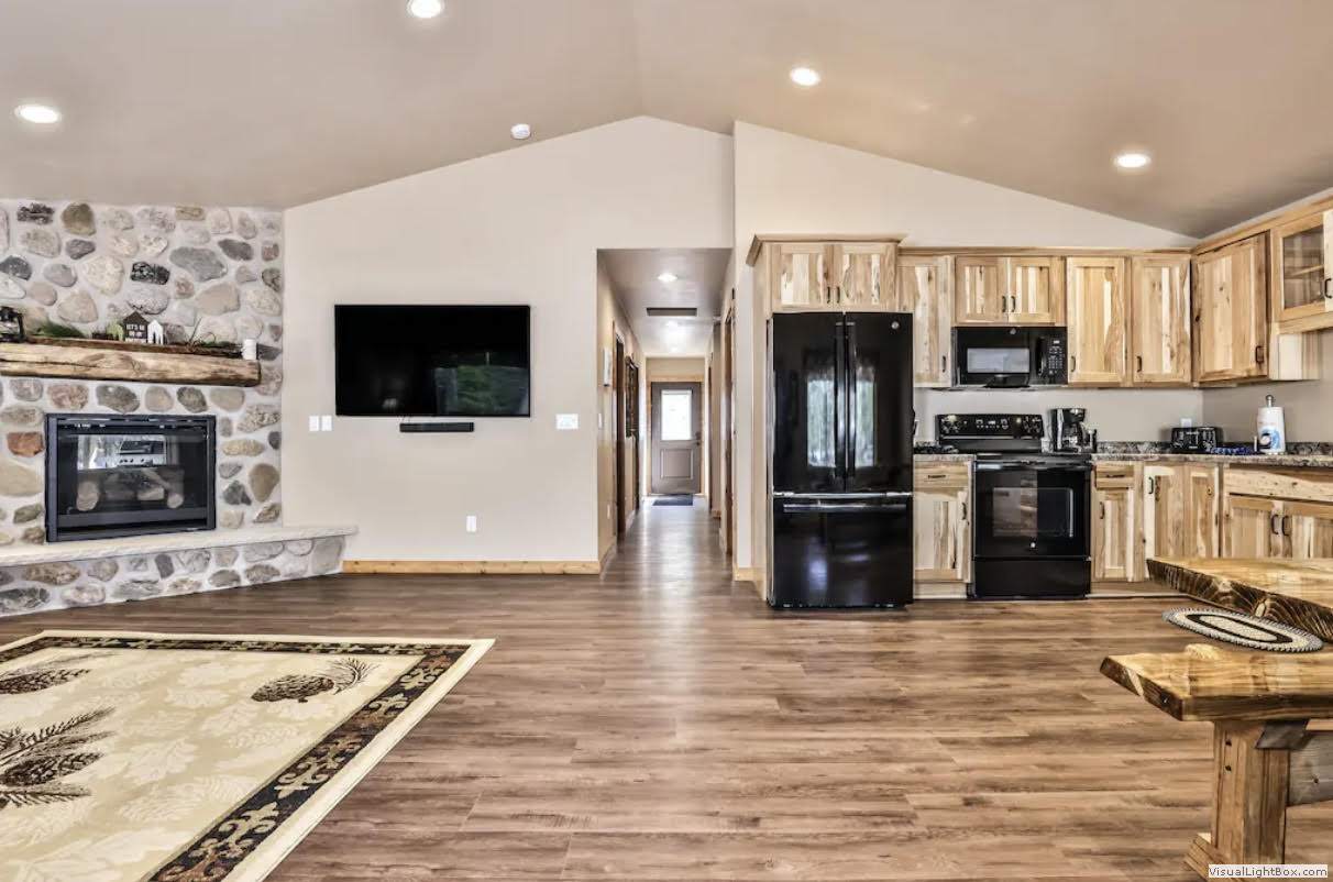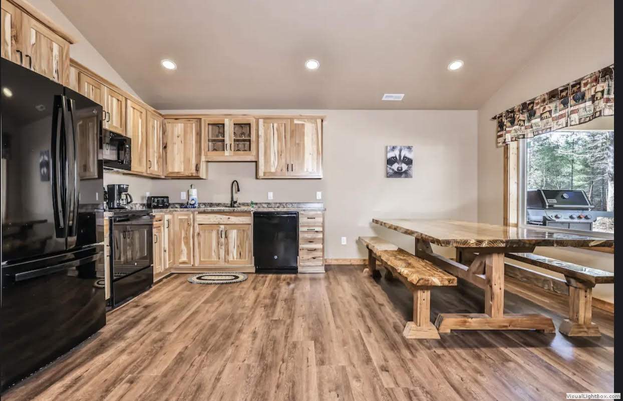 Inside either cabin, you'll find a bright interior and a cozy atmosphere throughout the well-appointed living area, blanketed in natural light. Enjoy the whimsical theme in both cabins, Raccoons in one and Deer in the other. Relax and make yourself at home by resting on the plush furniture, streaming a movie marathon on the large TV, or curling up with a good book by the crackling fire in the grand stone fireplace. The open-concept floor plan was designed with togetherness in mind so that no conversation would be lost here. Create culinary charms and outdoor adventures snacks in the sophisticated eat-in kitchen, equipped with brand-new appliances, ample cupboard room, and a formal dining table. Host barbecues, serve cocktails, or sip your morning coffee on the patio while listening to the tranquil sounds of nature.