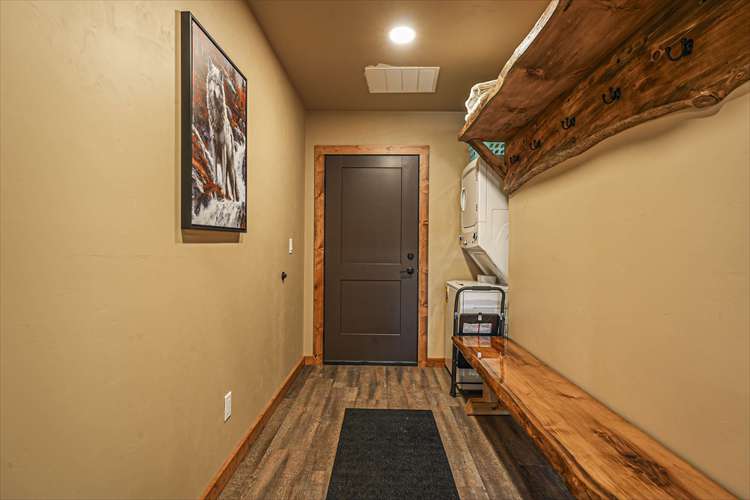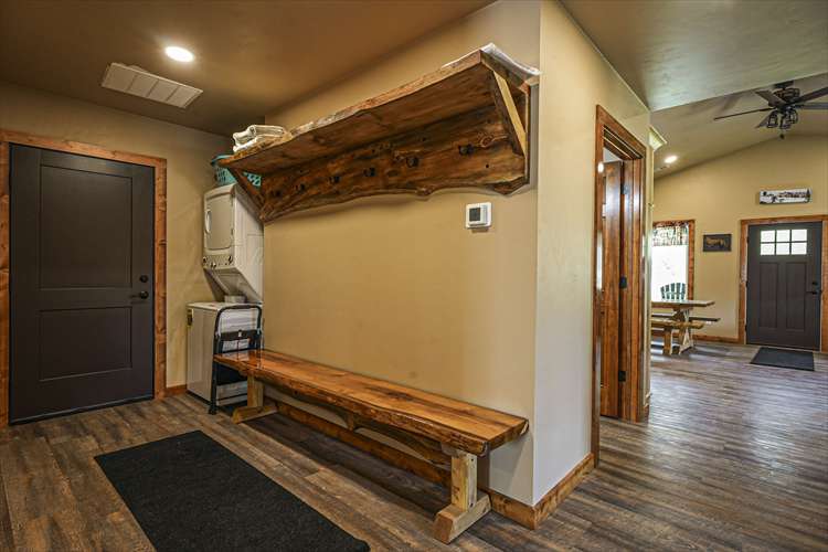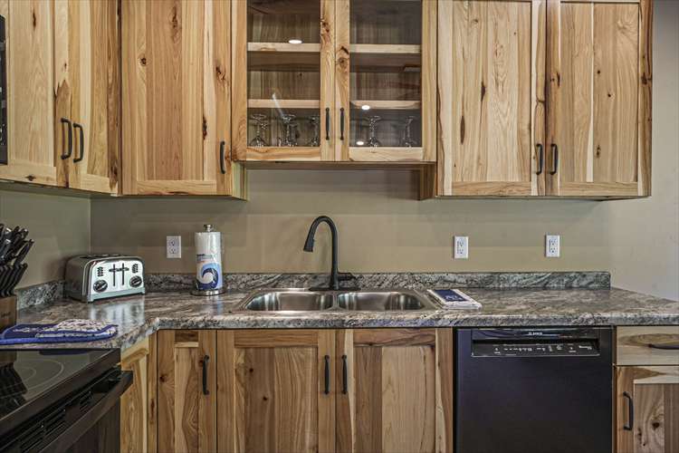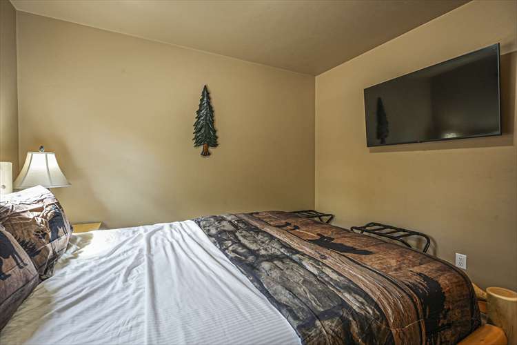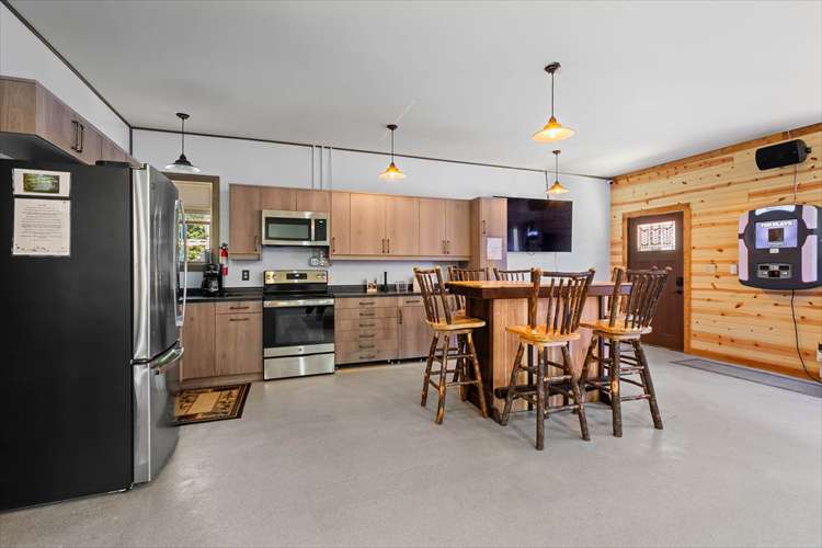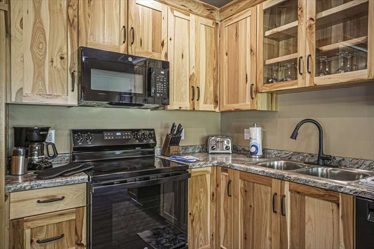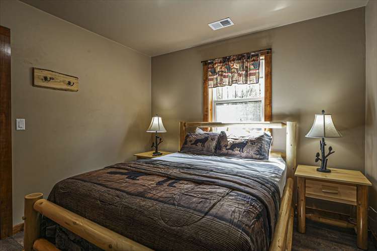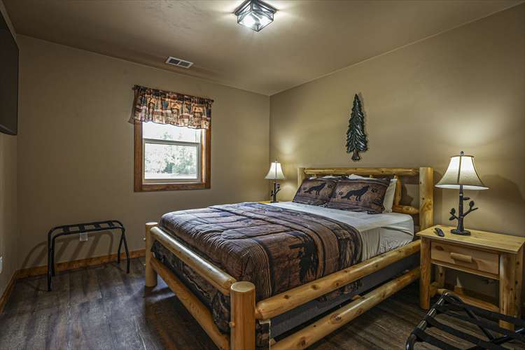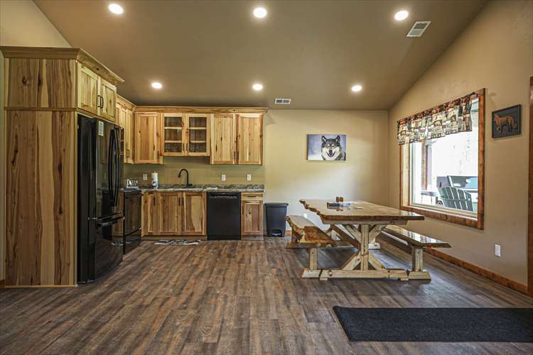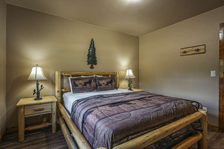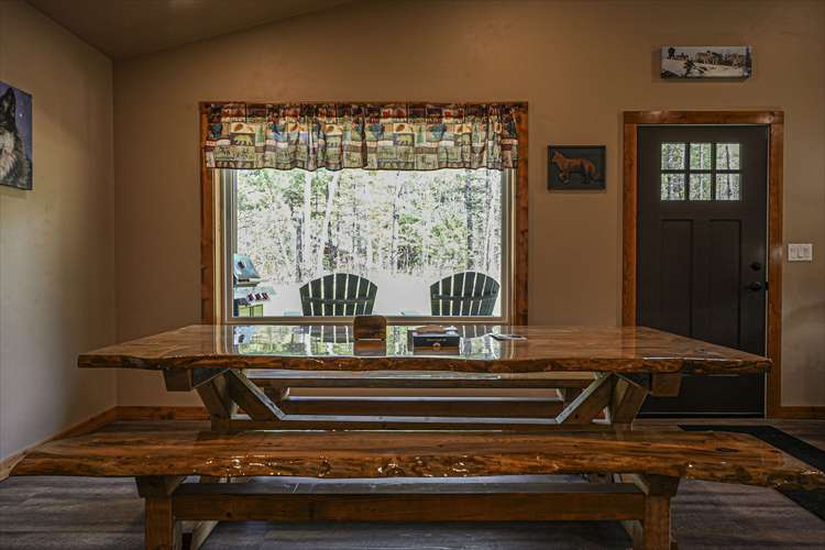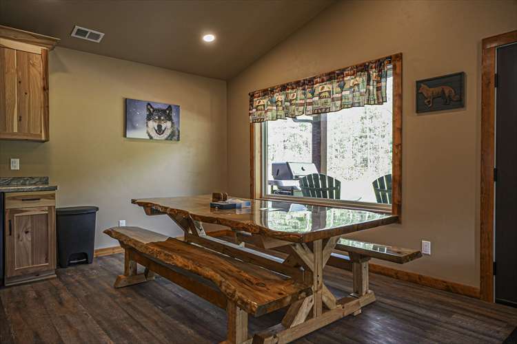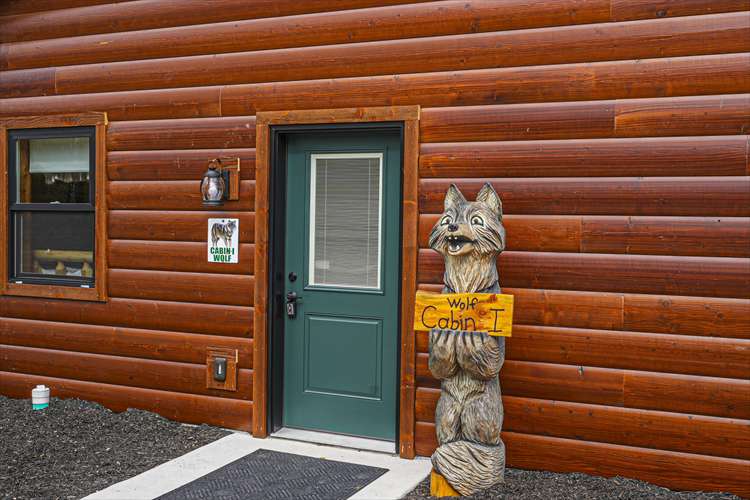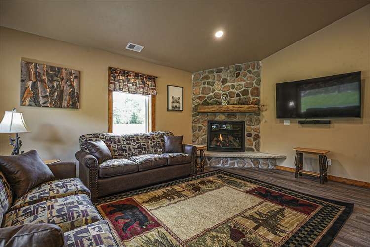 The Wolf Cabin has a bright interior and a cozy atmosphere greet you throughout the well-appointed living area. Enjoy the whimsical, natural theming throughout the space - from the decor to the rustic and modern furnishings. Relax and make yourself at home by resting on the plush furniture, streaming a movie marathon on the large TV, or curling up with a good book before a glowing fire in the grand stone fireplace. The open-concept floor plan was designed with togetherness in mind so that no conversation would be lost. Prepare grand meals or quick snacks for your outdoor adventures in the sophisticated eat-in kitchen, boasting brand-new appliances, ample cupboard room, and a formal dining table. Host barbecues or sip your morning coffee on the patio while listening to the tranquil sounds of nature.